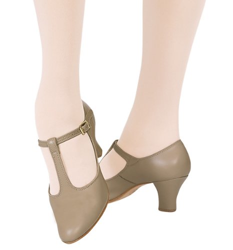 The stitched "T-strap" design by Capezio has a leather upper, 2" wrapped leather heel and scored leather sole. It has a tapered vamp, suede sock lining and heel counter, and arch cushion. Excellent character or tap shoe.